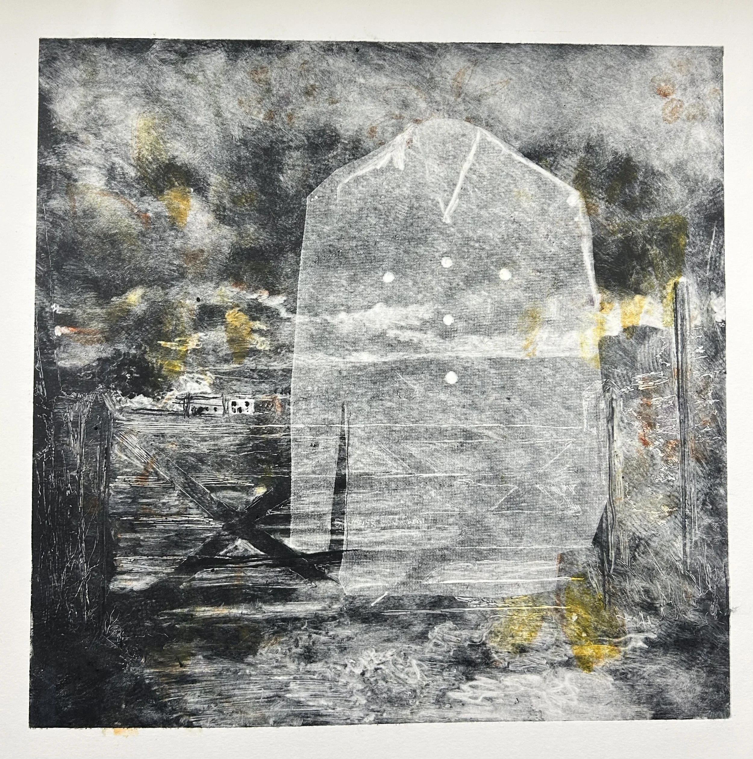 In the first print, I used thin bandage material shaped to mask the jacket, placing it on top of the plate to cover the ink. When the image was revealed, the background was dense, with a white hole for the jacket.