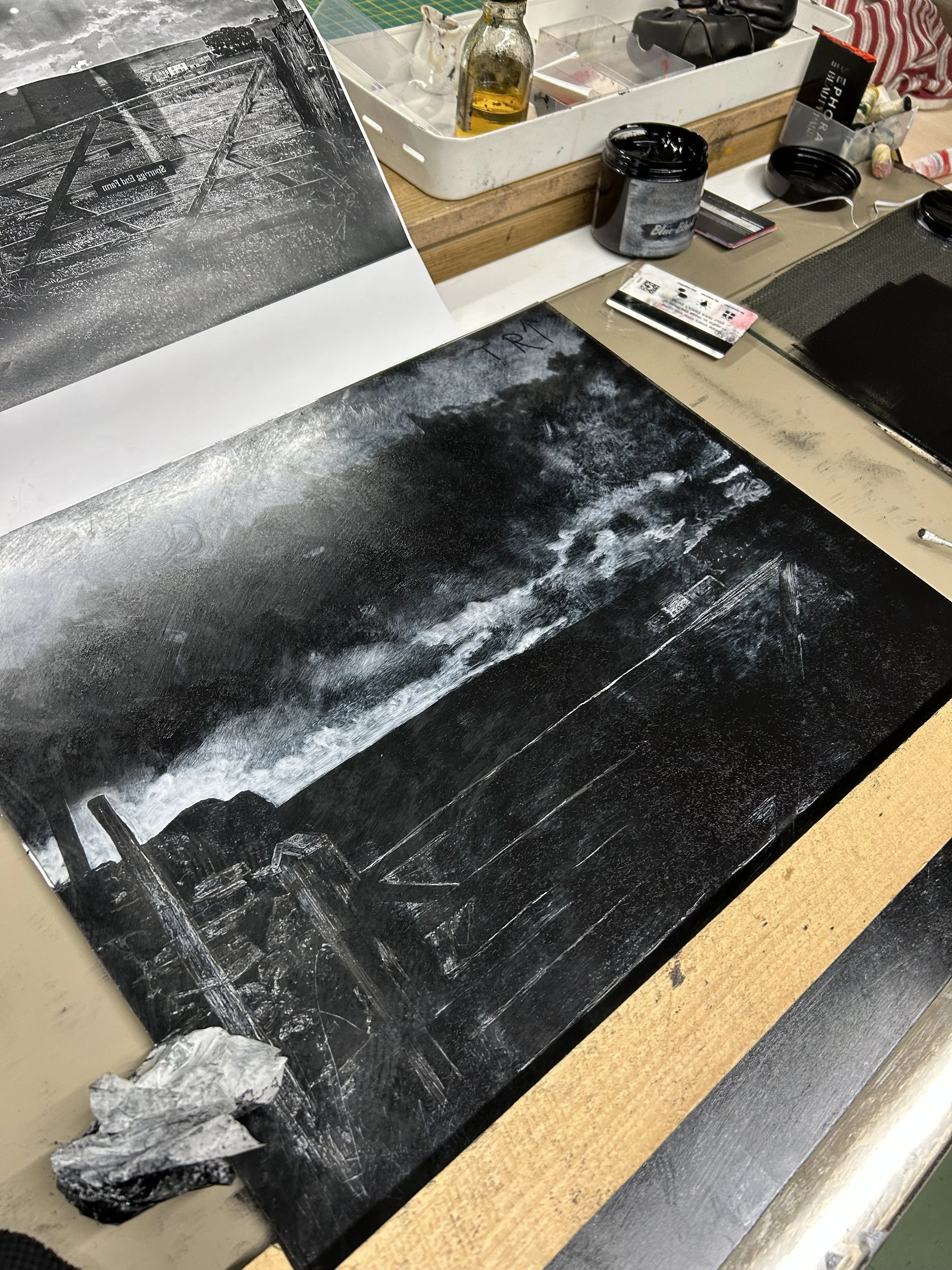 The foreground begins with a rollover of blue-black ink. An image emerges from this square of black. The details are added using the same tools employed in the foreground.