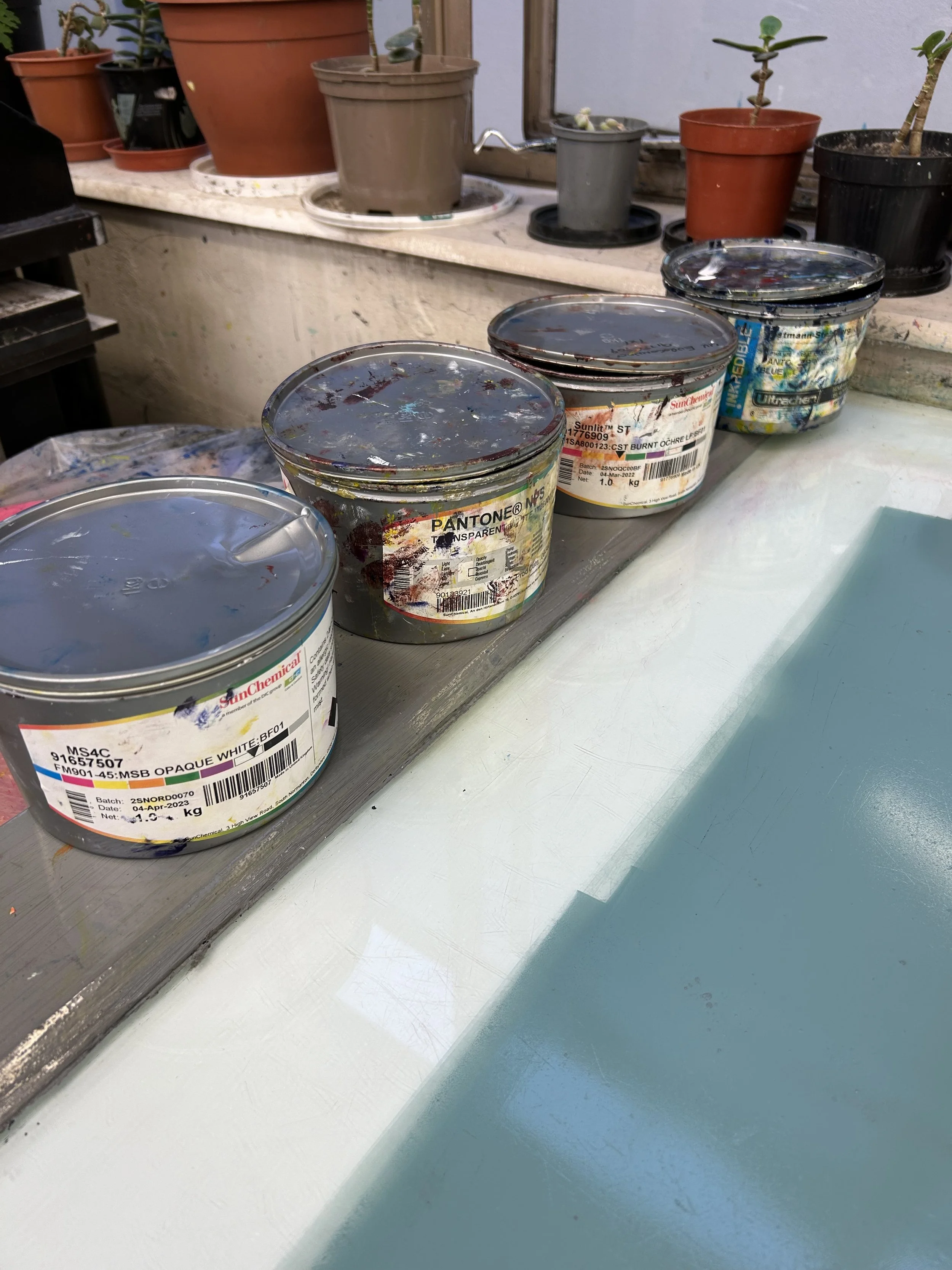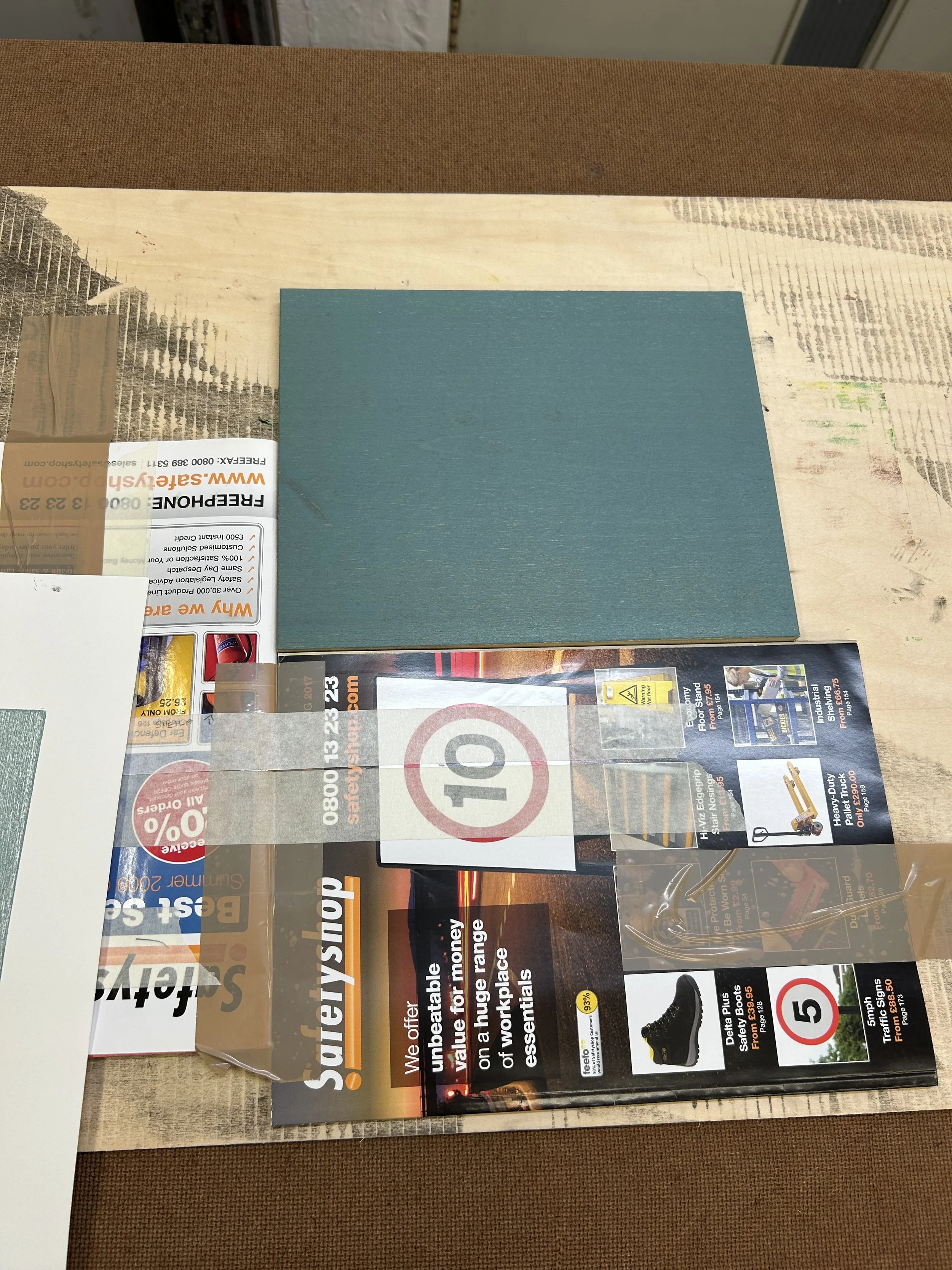 I used the reverse of my block to create the first base colour: a simple flat, slightly transparent green. This was mixed from Process Blue/Cyan, Transparent White, and a touch of Burnt Ochre, along with an extender.