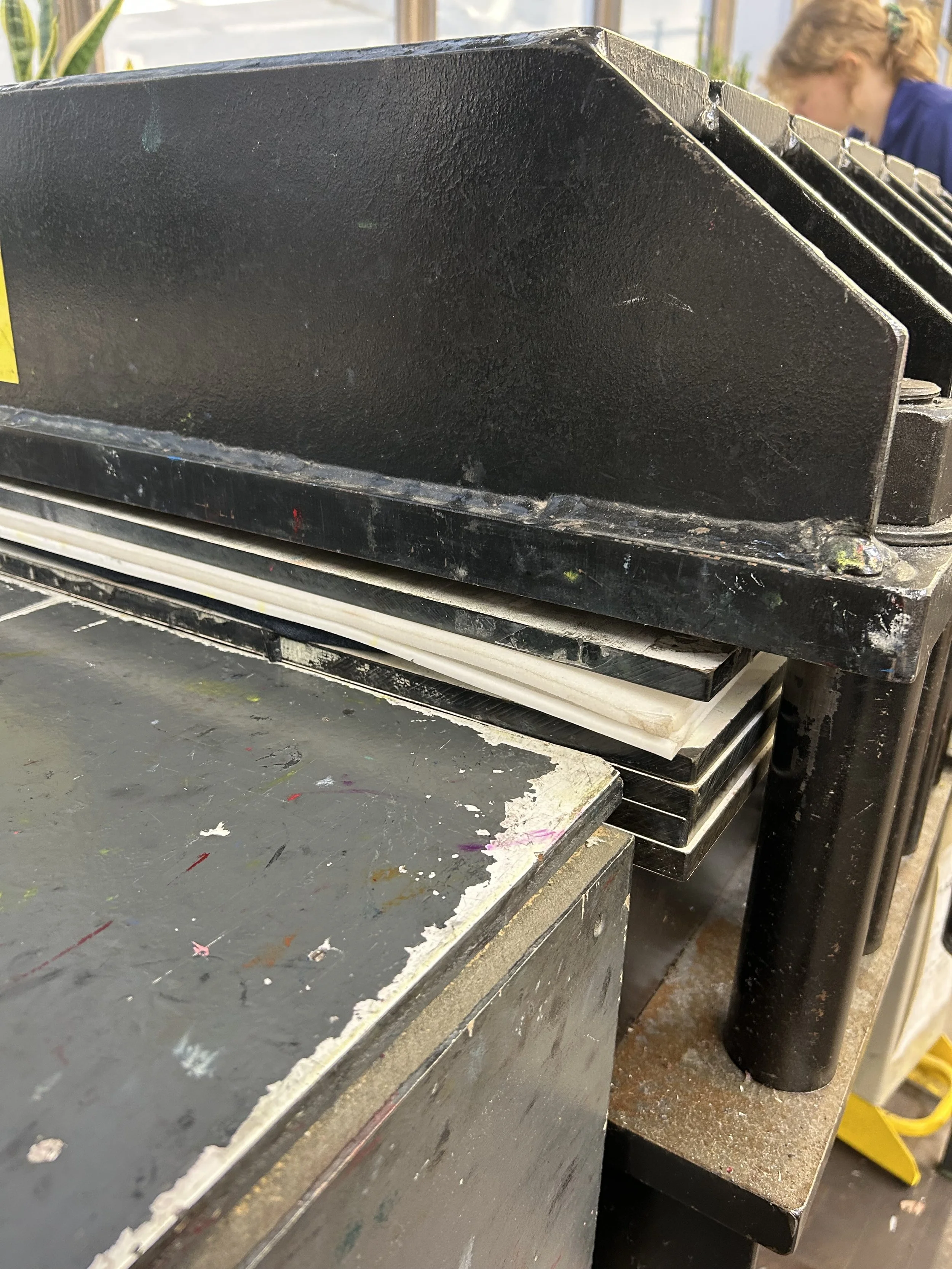 After looking at the two big presses in the studio we realised there were issues. The bulk of the jacket would not go through either press so it meant that I was going to have to use the Beever press in the relief area.