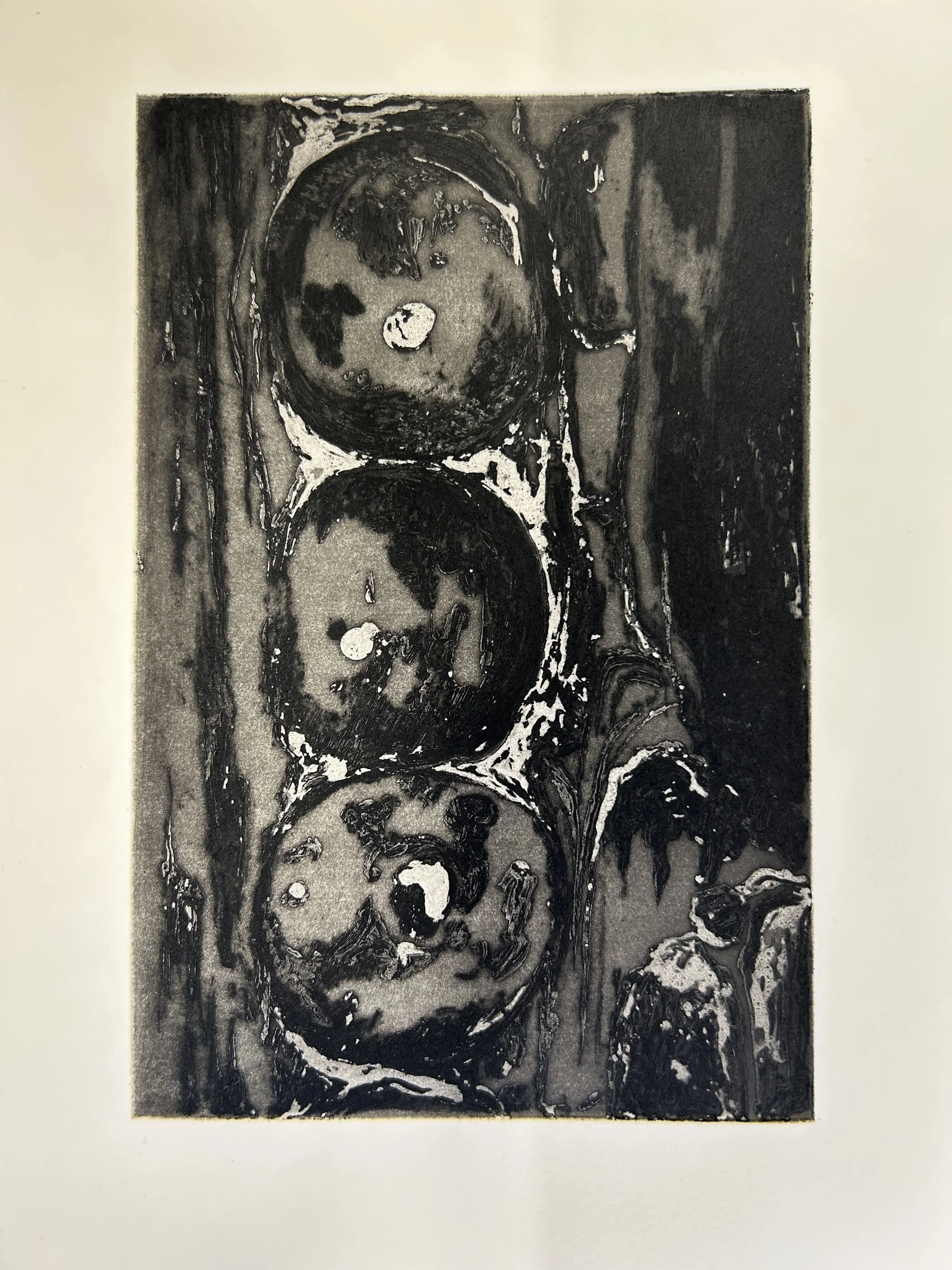 Plate prep was important. Steel has its own ‘tooth’ so white does not exist on the plate and produces a grey tone. To lighten this, sanding with Wet & Dry paper 400 grit prior to etching lifts the tone. The plate was thoroughly degreased