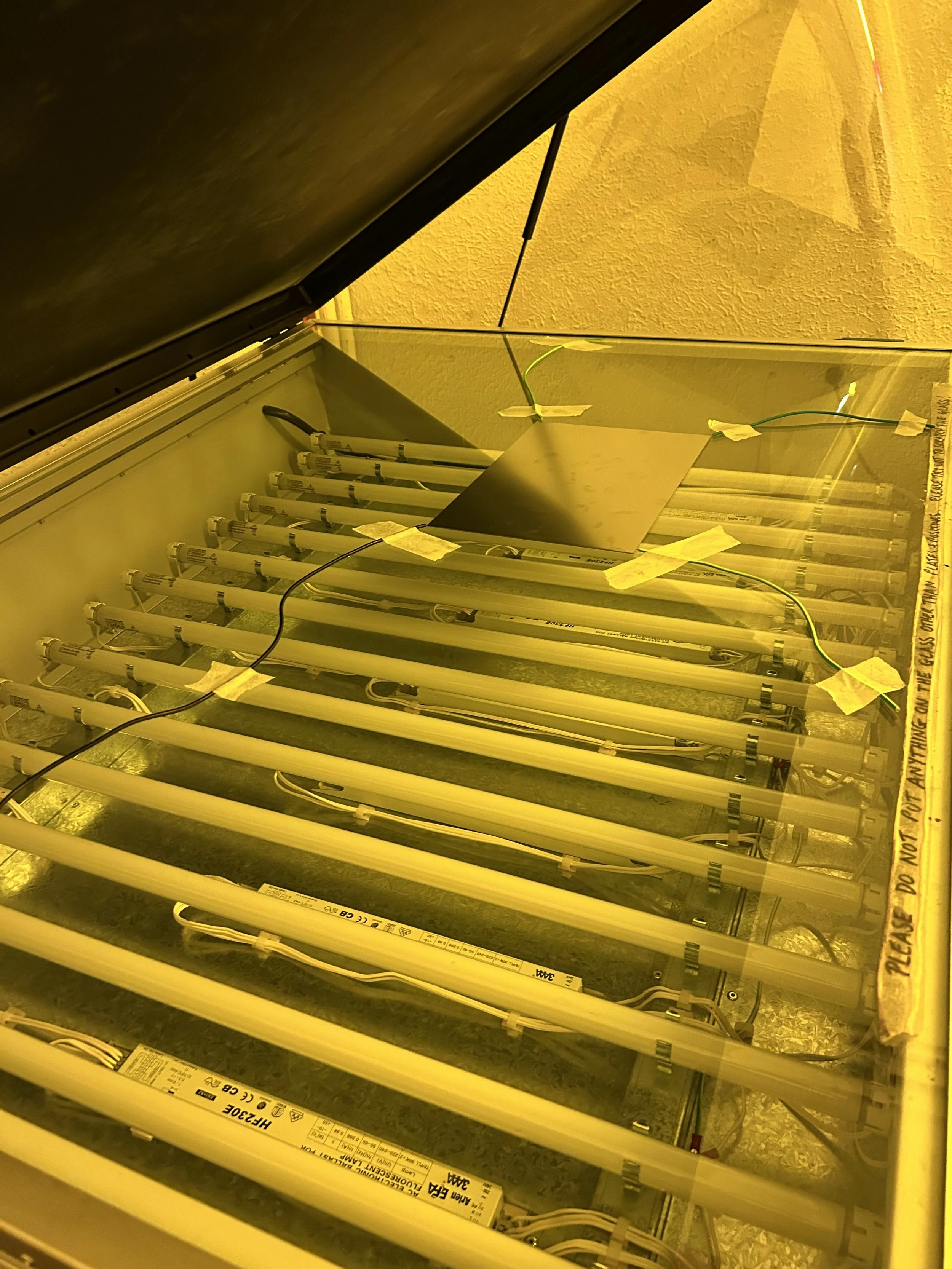 Back in the exposure room. Now it's taking my photo positive from Hexio and putting it into a plate. I'm going to use this as a backup for the limited print within my pattern.